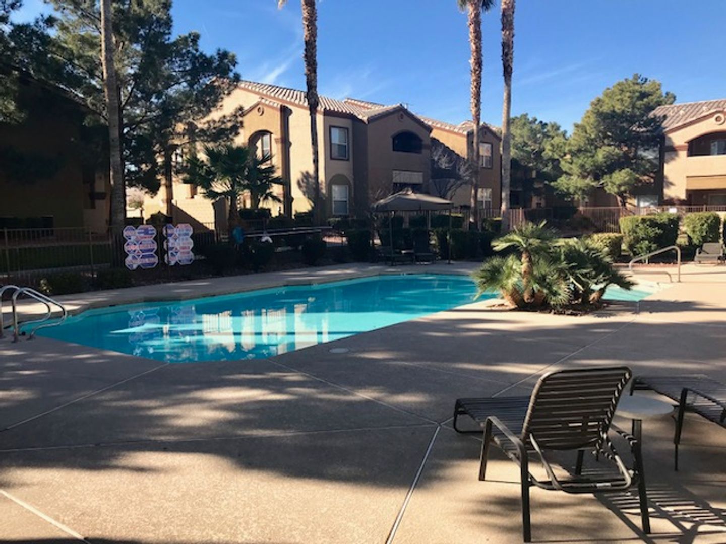 GREAT UPSTAIRS UNIT NEXT TO POOL NEAR THE STRIP!!! 1 BEDROOM BOASTS LAMINATE WOOD FLOORS IN LIVING ROOM- DINING ROOM & BEDROOM. TILE IN KITCHEN & BATHROOM, CEILING FAN IN BEDROOM & DINING AREA, GRANITE COUNTERS THROUGHOUT, ALL NEW APPLIANCES---STAINLESS KITCHEN APPLIANCES, LARGE BEDROOM WALK IN CLOSET, UTILITY ROOM W/BOTH WASHER/DRYER, BALCONY, GATED COMMUNITY WITH CLUBHOUSE, FITNESS CENTER, SPARKLING POOLS/SPAS, TENNIS COURT, AND RV PARKING!!!!